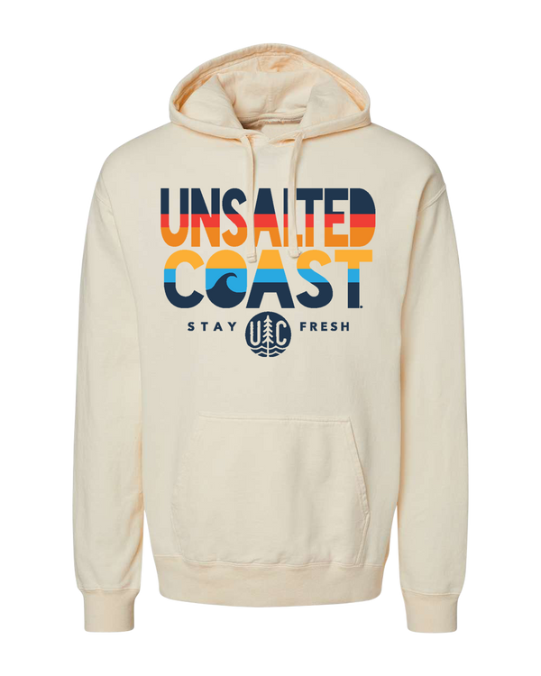 Butter soft and cozy hoodie with our Sunset stripes design. This will be your softest hoodie that you own. 8.5oz., 80/20 ring spun cotton/ polyester blend. Vintage washed and garment dyed....